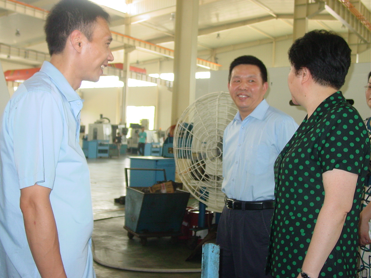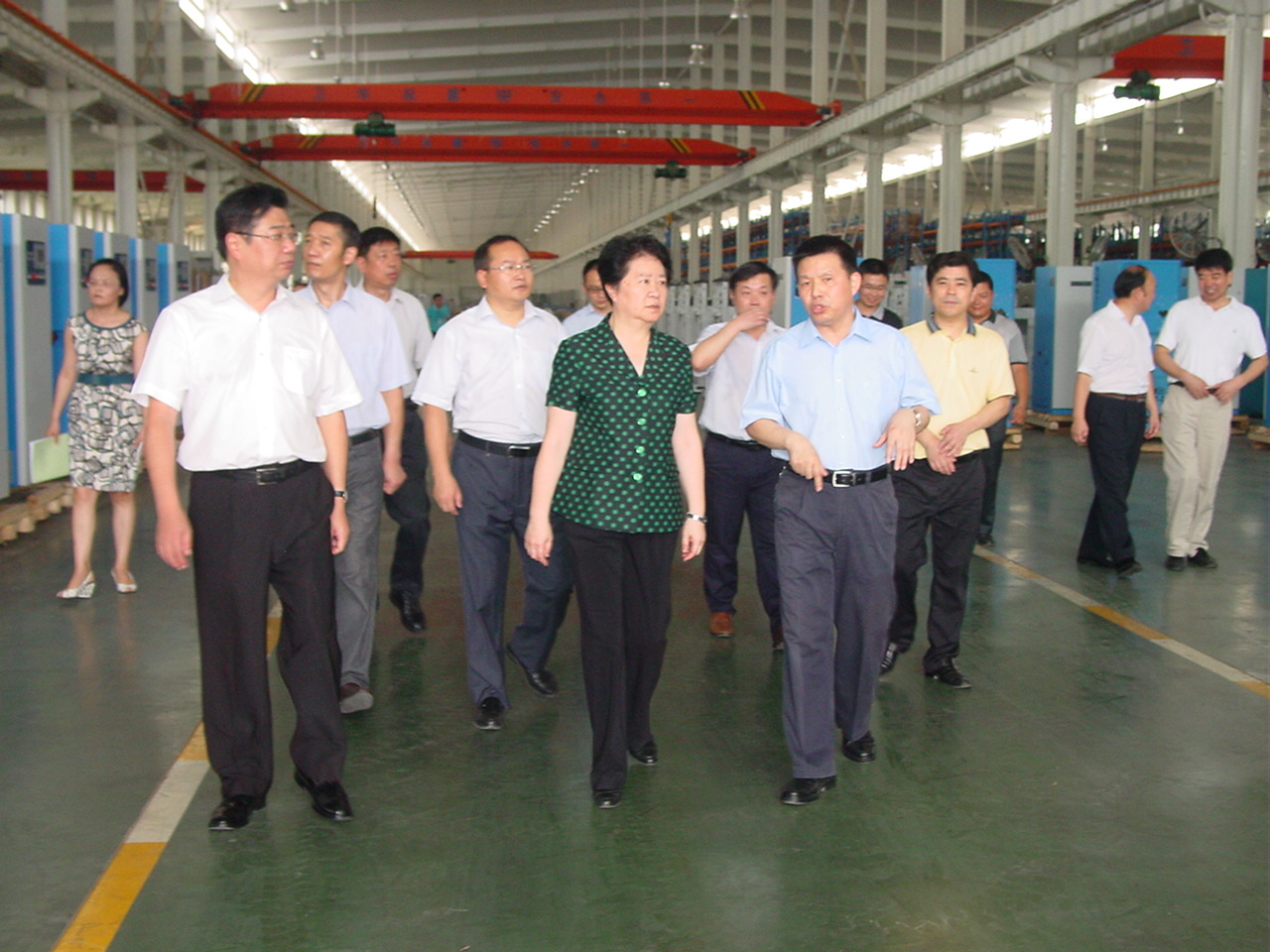 圖一張岱梨(左二),在天門市委書記柯俊(左一)等市領(lǐng)導(dǎo)和天門紡機(jī)公司董事長沈方勇(右一)等公司領(lǐng)導(dǎo)的陪同下,在天門紡機(jī)板件車間視察的場景。